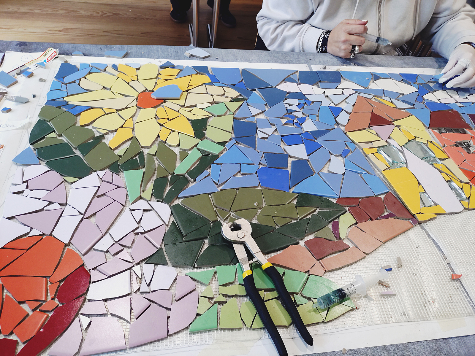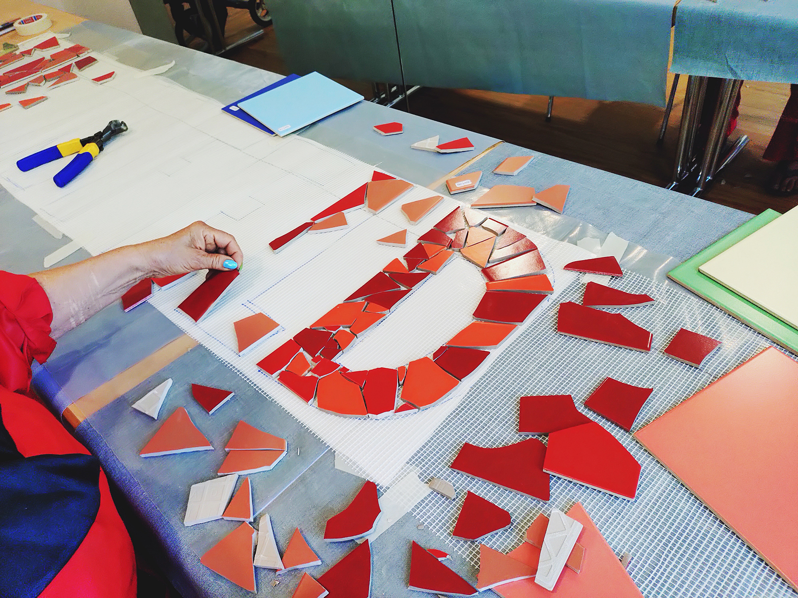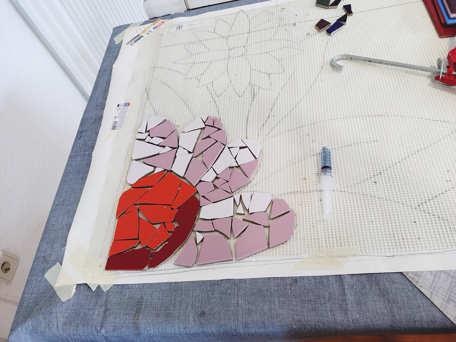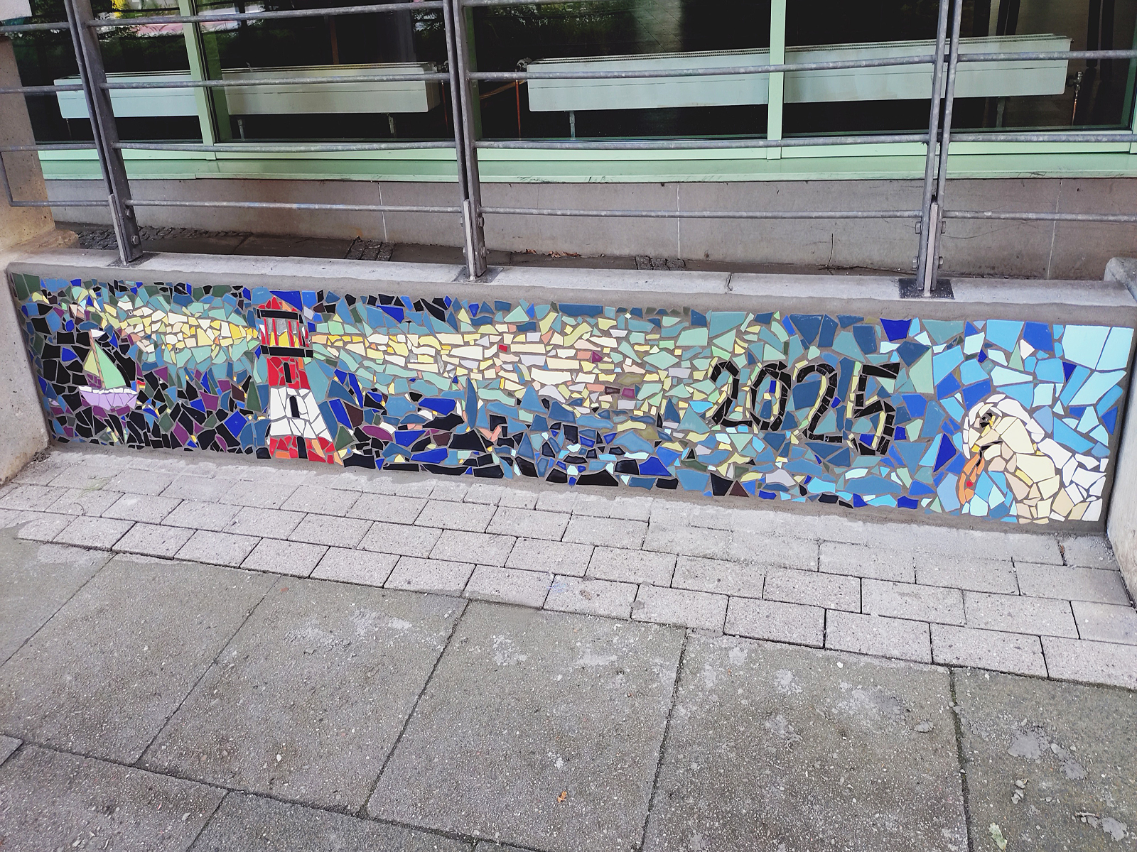 Der dritte Teil entstand eher spontan als Schriftzug in Rottönen, mit Blumen an der Seite. Ähnlich der vierte Teil, als eine Mosaik Interessierte zufällig eintraf und sich was Maritimes wünschte, Leuchtturm, ein Segelschiff.... und die Möve darf dann natürlich auch nicht fehlen. Dieses vierte Mosaikstück symbolisiert Hamburg, inklusiver der Jahreszahl 2025, die Entstehung dieses einzigartigen Mosaikprojektes.