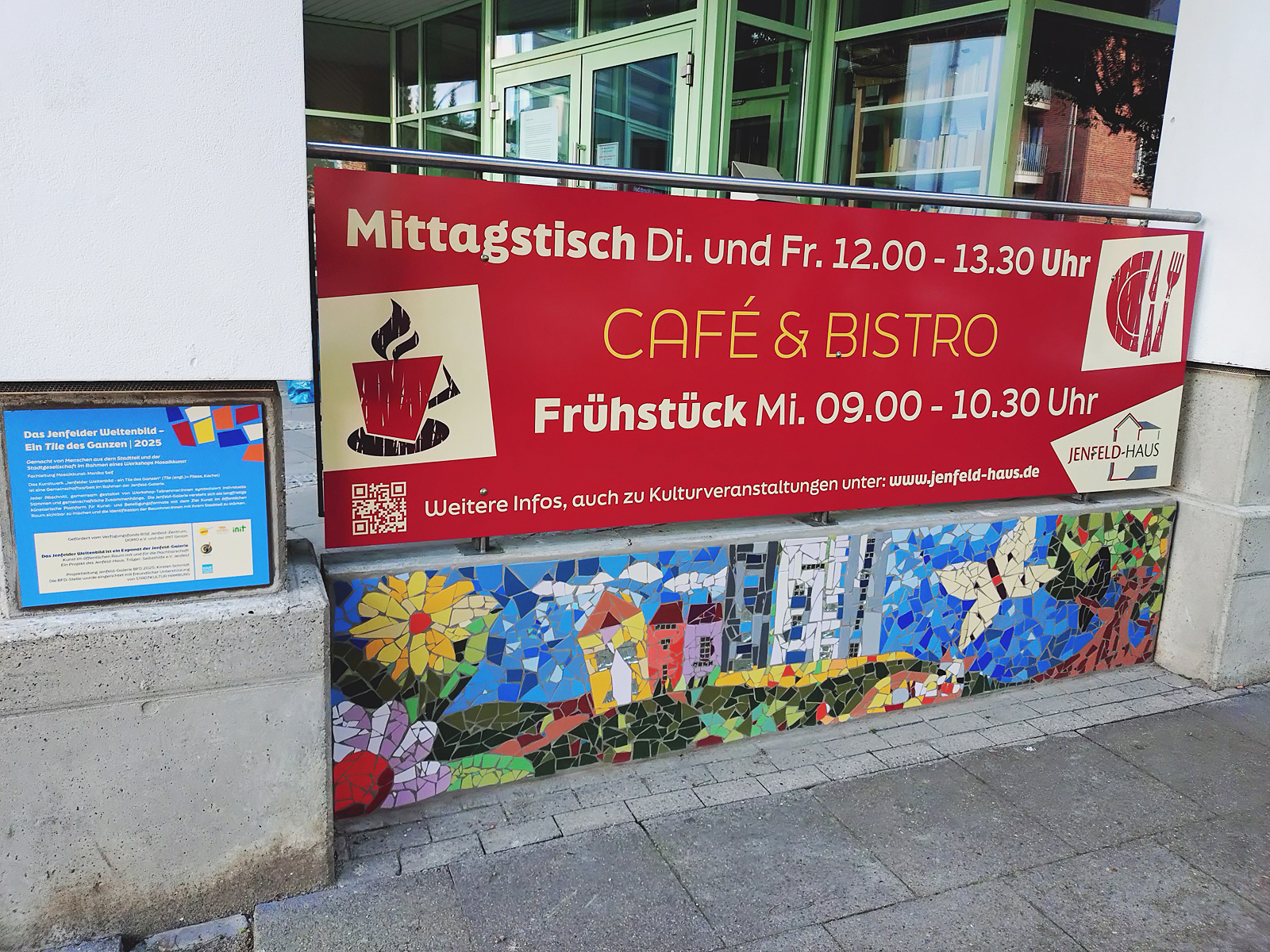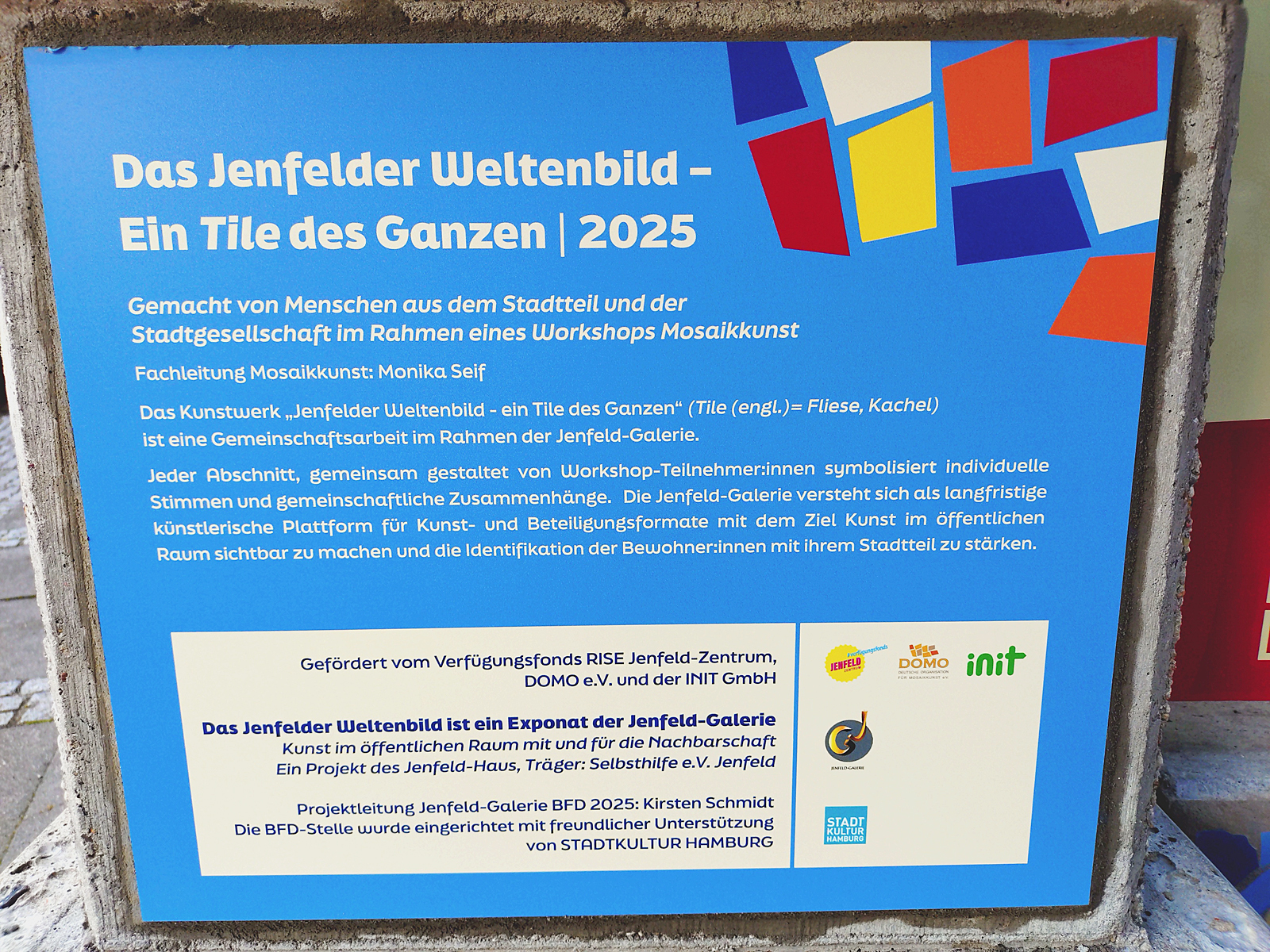 Im Rahmen der Jenfeld-Galerie startete im Juni ein öffentliches Mosaikprojekt mit Bürgerbeteiligung im Stadtteil Jenfeld. Gestaltet wurde ein 12 Meter langer Betonsockel am Haus. Für die einzelnen Stücke von jeweils. ca 3 x 0,6 m entstanden erstmal Ideen, die auf Papier skizziert wurden. Vielfalt und Frieden waren Begriffe, die genannt wurden, aber auch der Stadtteil an sich sollte dargestellt werden. Jenfeld hat seinen Namen vom "gelben Feld" (gelbe Erde). Den Stadtteil an sich prägen Hochhausbauten sowie Einfamilienhäuser und viel Grün. "Im Jenfeld gibt es ganz viele Raben", erzählte eine Teilnehmerin, eine Katze wünschte sich eine andere. Aus diesen "Bildern" galt es nun ein Gesamtkonzept zu erarbeiten.