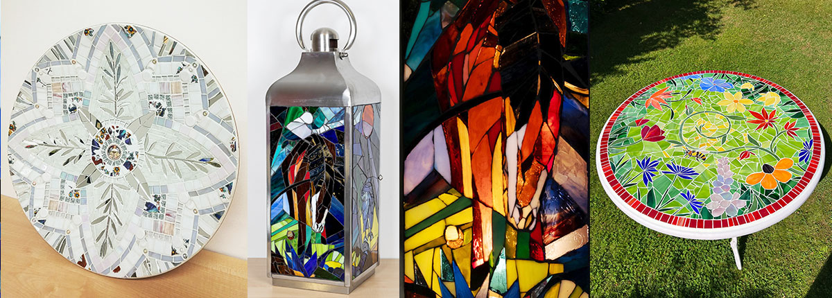 Mit Buntglas, allgemein auch als farbiges Flachglas benannt, lassen sich unterschiedliche Objekte gestalten und verzieren. Verschiedene Glassorten, von transparent bis opak, in einfarbig, strukturiert, irisierend oder Ornamentgläser, bieten unendlich viele Optionen in der Gestaltung mit unterschiedlichen Farbvarianten und Facetten. Glas ist wetterbeständig und somit auch für Außen geeignet. Im Licht entfaltet Buntglas seine ganze Leuchtkraft, Ornamente, Strukturen und die Farbigkeit kommen in voller Pracht zur Geltung. Mosaikobjekte für die Terrasse oder den Garten, wie Tische, Laternen, Gartenkugeln, Blumentöpfe oder Säulen können mit Glas (und / oder Fliesen) gestaltet werden. Im Innenbereich eignet sich Glas zur Gestaltung einzelner Bereiche oder Objekte: Spiegel, Tische, Laternen, Bilder und Portraits sind nur ein paar Beispiele von vielen individuellen Möglichkeiten.