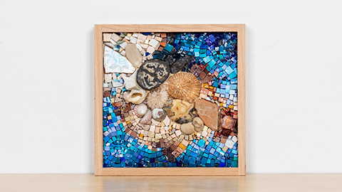Smalten sind kleine Glassteine die aus einem "Glaskuchen" in Stücke geschlagen werden, die Bruchkante dient als Ansicht. Diese schönen, farbintensiven Steine lassen sich mit einer Zange zerkleinern und wunderbar mit anderen Materialien kombinieren - Natursteine, Muscheln und Fliesen geben einen schönen Kontrast. Beim arbeiten mit Smalten wird nicht verfugt. In der Regeln füllen wir einen quadratischen Rahmen.