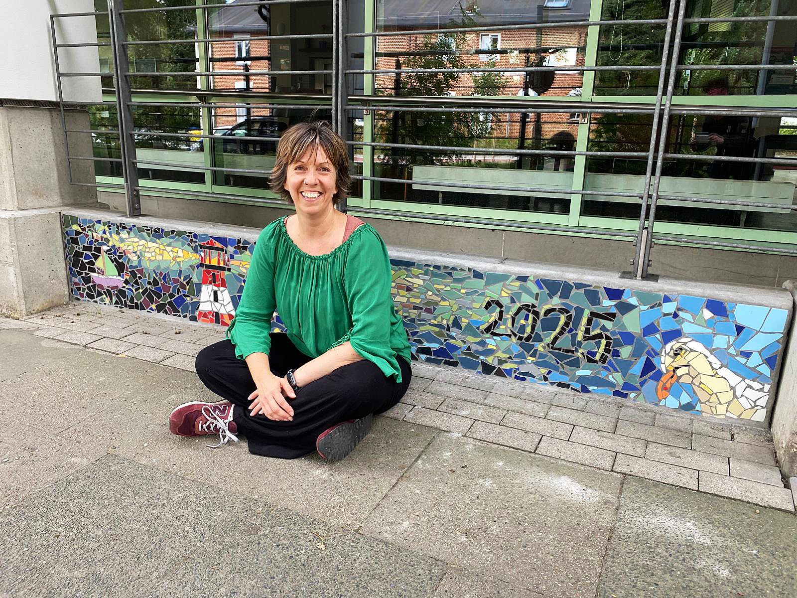 Der dritte Teil entstand eher spontan als Schriftzug in Rottönen, mit Blumen an der Seite. Ähnlich der vierte Teil, als eine Mosaik Interessierte zufällig eintraf und sich was Maritimes wünschte, Leuchtturm, ein Segelschiff.... und die Möve darf dann natürlich auch nicht fehlen. Dieses vierte Mosaikstück symbolisiert Hamburg, inklusiver der Jahreszahl 2025, die Entstehung dieses einzigartigen Mosaikprojektes.