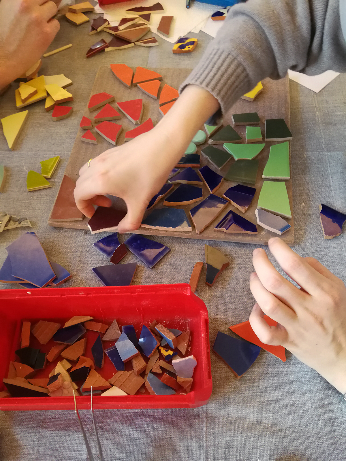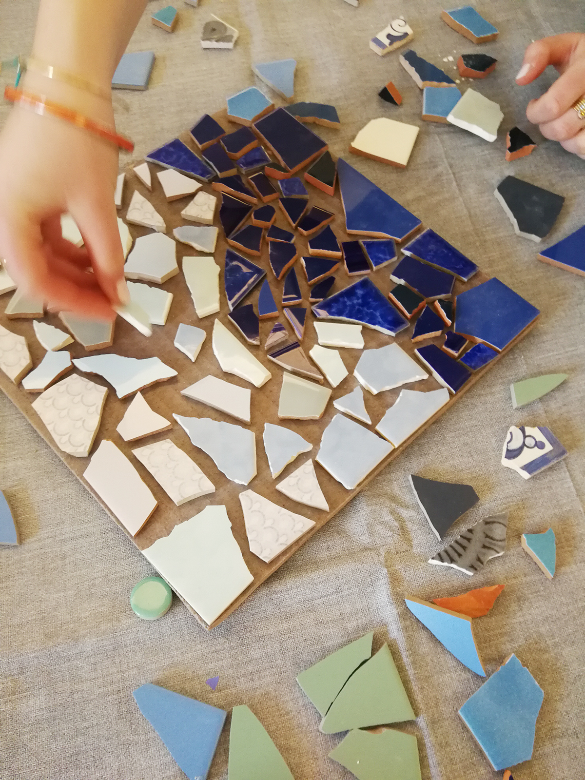 In der Regel arbeiten wir mit Fliesen. Glas, Natursteine und andere Elemente können mit eingearbeitet werden: z.B. Schrauben, Metall- und Holzteile, je nachdem wo das Mosaik später hängen / angebracht werden soll (Innen- oder Aussenbereich).