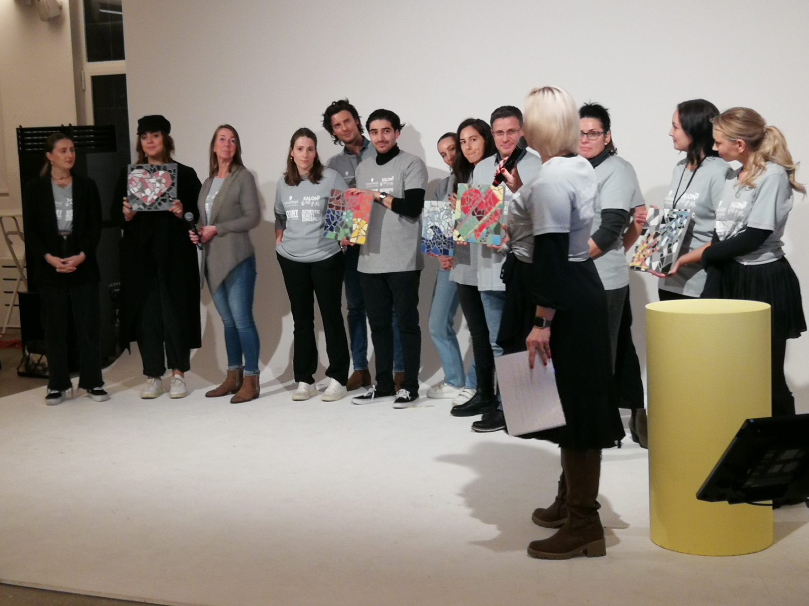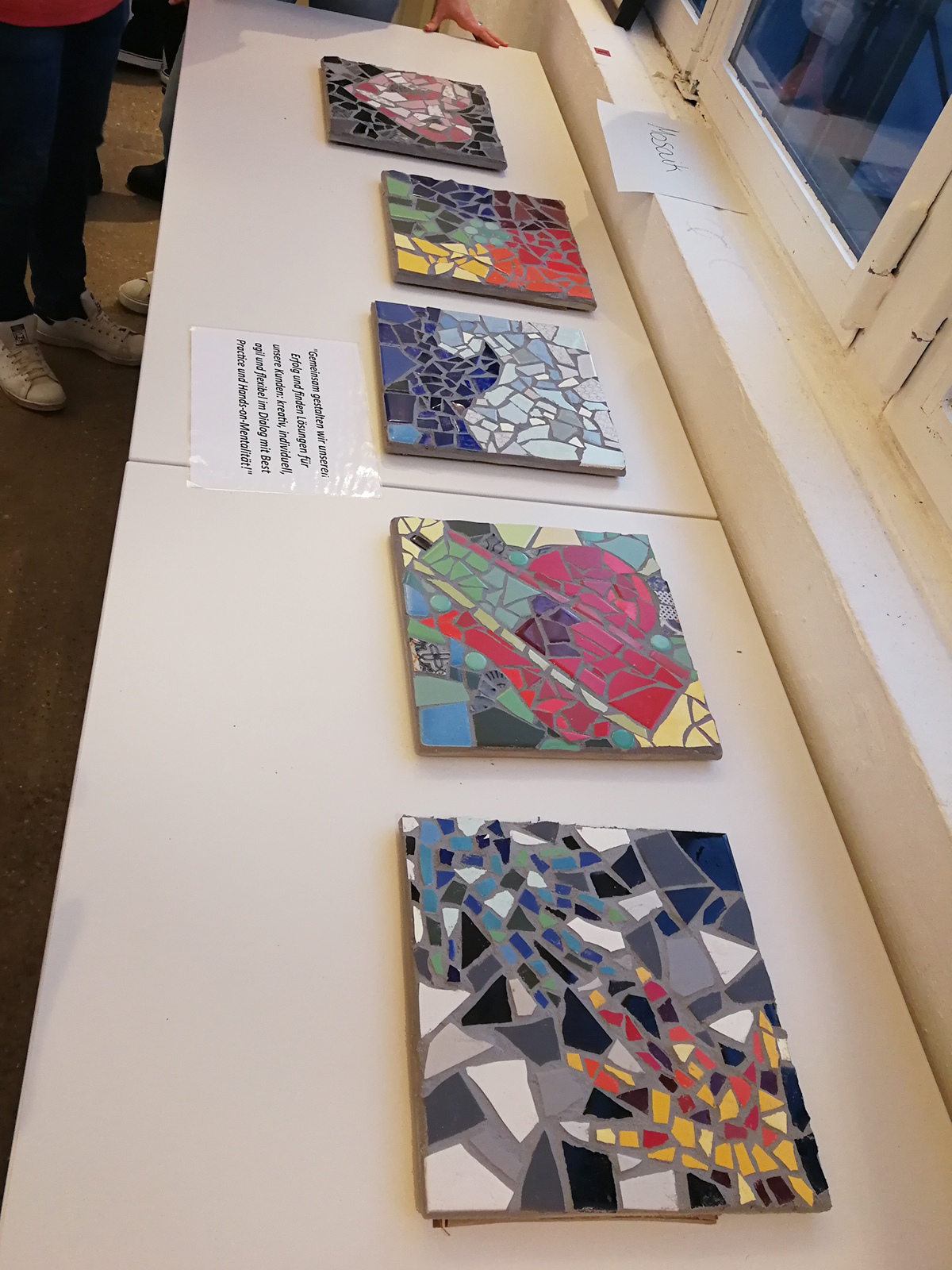 Ein kreatives Firmenevent von Schwarzkopf, organisiert von der Agentur Vagedes Schmid, mit unterschiedlichen Stationen im kreativen Bereich. Neben Mosaik gab es Collagen zu gestalten, Keramik-Skulpturen, Fotografien, sowie Teampainting "Bilderkarussell". Die Mosaike wurden in fünf Gruppen mit je drei bis vier Personen erarbeitet. Jede Gruppe gestaltete nach eigenen Ideen, passenden zur Firmenphilosophie in Bezug auf Kunden und Produkte, das Mosaik mit Fliesenbruch auf einer 30x30 cm großen Platte.